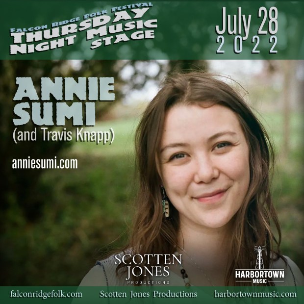 Annie Sumi (with Travis Knapp) is one of fourteen acts to appear at the 2022 Falcon Ridge Folk Festival Thursday Night Music Stage.